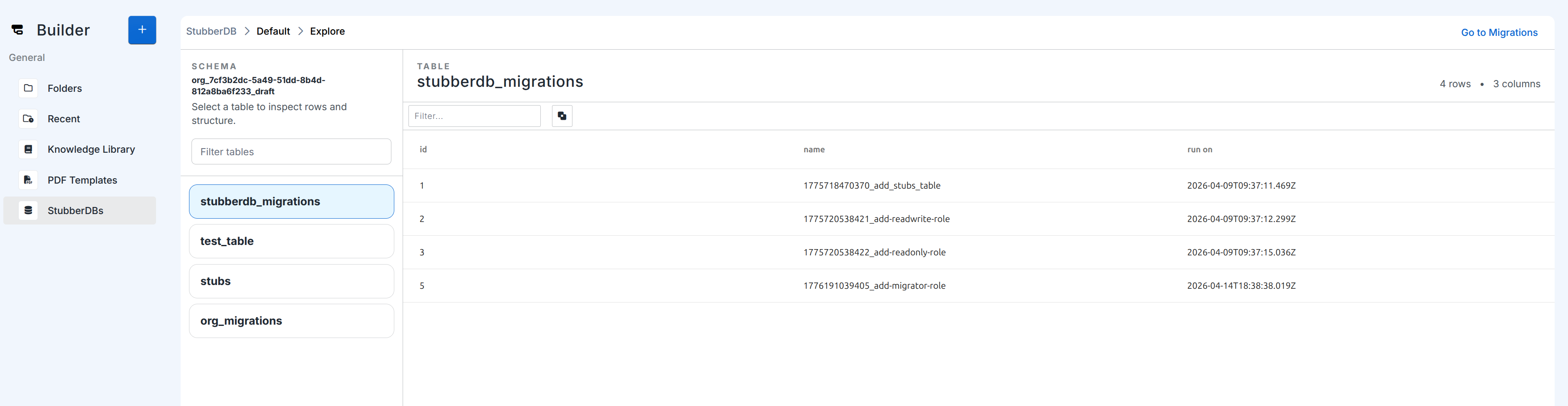 StubberDBs include a Migrations view for managing your database schema.