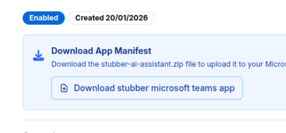 Before uploading to Teams, you need to download the Stubber app manifest from your Stubber profile: